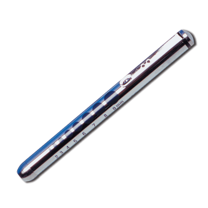 Metallista valmistettu kestävä kynävalo pupillimitoilla. Käyttää 2xAAA paristoja jotka toimitetaan pakkauksen mukana.
